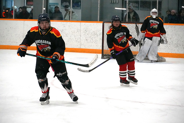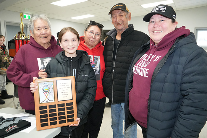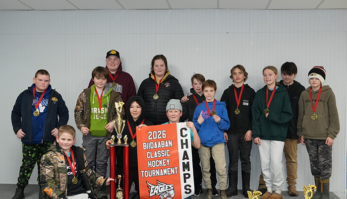 Once tournament games finished up, spectators and students moved to the upstairs room overlooking the ice; much warmer and more comfortable than the rink area. This also served as a comfy space to hangout during the day if your team wasn’t playing and gave a bird’s eye view of the hockey action. Mr. Lester called attention to the awards celebration, citing that the winners’ names and their school will be engraved on the grand prize trophy. While the trophy remains in the display cabinet at Biidaaban, the winning school received a large sized 2026 Champs banner, with the second-place team receiving a 2026 Runner Up banner. Most Valuable Player (MVP) trophies were awarded to each team as follows: Shawanosowe Bobcats player, Leo, was named Tournament MVP, Lakeview MVP is Bray, Sacred Heart MVP is Chase, and Biidaaban MVP is Avery. All First and Second Place team members were presented with tournament medals. A memorial trophy honouring Rennison Ruth, was awarded to the Outstanding Team Player of the Annual Biidaaban Classic. This year’s recipient was Gavin Eshkakogan! Congratulations, Gavin! and to his Mama, Brooke Eshkakogan, who cheered loud and proud “I’m his Mama!” as she hurried up [sporting a hoodie with the caption ‘Hockey is Good Medicine] for a photo opportunity. The trophy was presented by Myna Toulouse – the late Rennison’s, Nohomis (grandmother) and Jennifer Ruth – Rennison’s mother, Myna’s daughter).