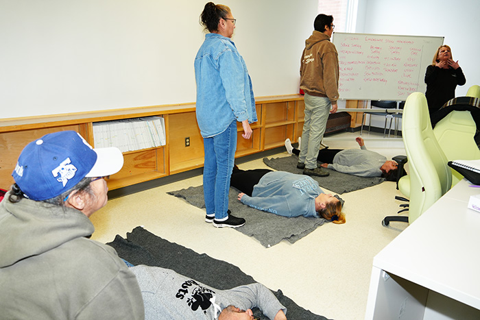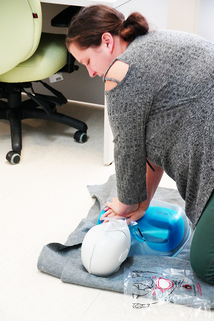 Staff members at the Lifelong Learning Centre took part in a St. John’s Ambulance First Aid program at the end of January. Some needed to update their certification, and some were taking the training for the first time as part of health and safety compliance measures; it is imperative that staff have knowledge and training in these life-saving skills for both personal and professional purposes. While staff were learning some of the many important maneuvers throughout the day, we managed to capture a few who were not too shy to have their photo taken. Miigwech to Debbie for instructing the course, and inspiring a lot of laughter amongst students, creating a lighter atmosphere during what can be a serious and process-oriented training.