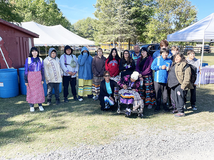 Biidaaban Kinoomaagegamik was represented by the Grade 8 students, their teacher Mr. Kevin Maracle, support staff, Ms. Jeanette Steinke, and Land-Based Lead, Michael Abitong. Staff and students were dressed in ribbon skirts and ribbon shirts to celebrate and honour this special occasion.