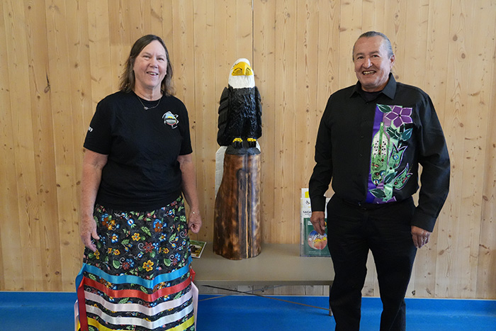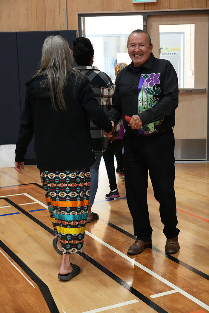 On the morning of September 12, Gimaa Toulouse, wearing an ornate, purple-flowered ribbon shirt, visited the staff and students of Biidaaban Kinoomaagegamik. He was invited to attend the school for his traditional yearly visit. (Last year, the Grand Opening of the new Biidaaban school took the place of the Welcome Circle.)