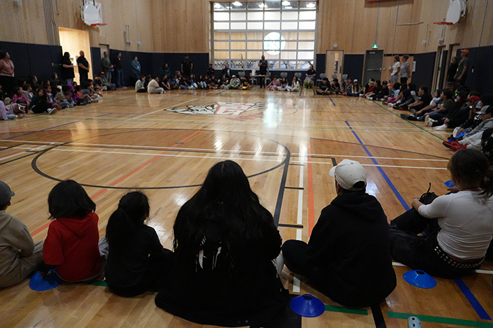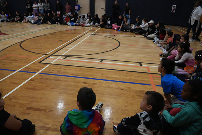 A drumming song and opening prayer started the event off in a good way. Principal Becky Toulouse welcomed everyone to the Welcome Circle with Gimaa and provided some thoughtful opening remarks. Michael Abitong followed with some commentary in Anishinaabemowin, then translated it into English. He encouraged the students to use their Anishinaabe language, to speak it openly, to take pride in their culture and themselves, and to live their lives in a good way, following the seven Grandfather Teachings. Michael imparted to the students how fortunate they were to receive the gift of education, how the teachers and helpers were here to support them throughout the school year, and to respect and appreciate the effort and thought that goes into their education experiences. Michael rallied the students with a thunderous ‘Aanii Biidaaban students’, eliciting an equally loud ‘Aanii’ response, cheers, and enthusiasm circling around the room. The energy was alive and well in the school.