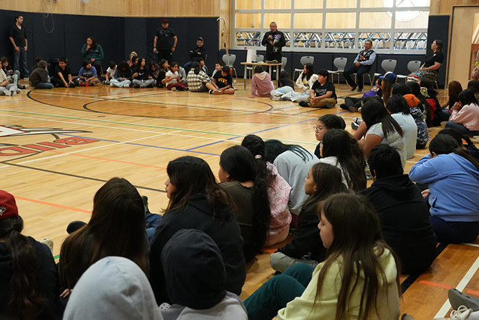 Chief Toulouse took to the centre of the circle and shared some encouraging sentiments and knowledge with everyone present, beginning first in Anishinaabemowin and then switching to English. Students listened intently as the Chief spoke, and his words carried the message about the importance of maintaining the Anishinaabe language, culture, traditions, valuing and protecting the animals, water, territorial lands, the students themselves, and recognizing everything is an integral part of the world; each with special abilities and purpose. He encouraged the students to always seek the path they chose to walk and to make good choices as they moved along that path, knowing they were supported by friends, teachers, family, caregivers, Elders, and the community. There is strength in community and in Anishinaabe culture and ways, and he requested that students continue to be the stewards/ambassadors of these traditions.