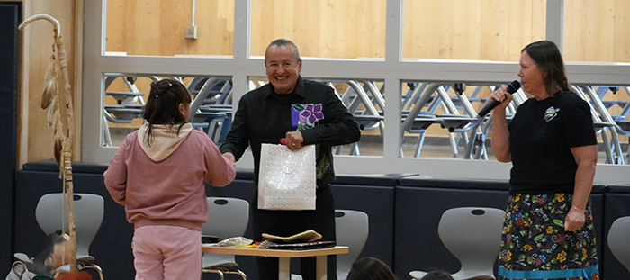 Gimaa was presented with a gift by a student, on behalf of the Biidaaban staff and students, in recognition of his welcoming them to the new school year and sharing his insights with them. Miigwech, miigwech, miigwech. The gathering came to a close, and students filed out of the gym past Gimaa and returned to classroom instruction, carrying with them a warm fire within, ignited by a personal greeting from their Gimaa, and the positive, uplifting sentiments shared with them by leadership on this special occasion.