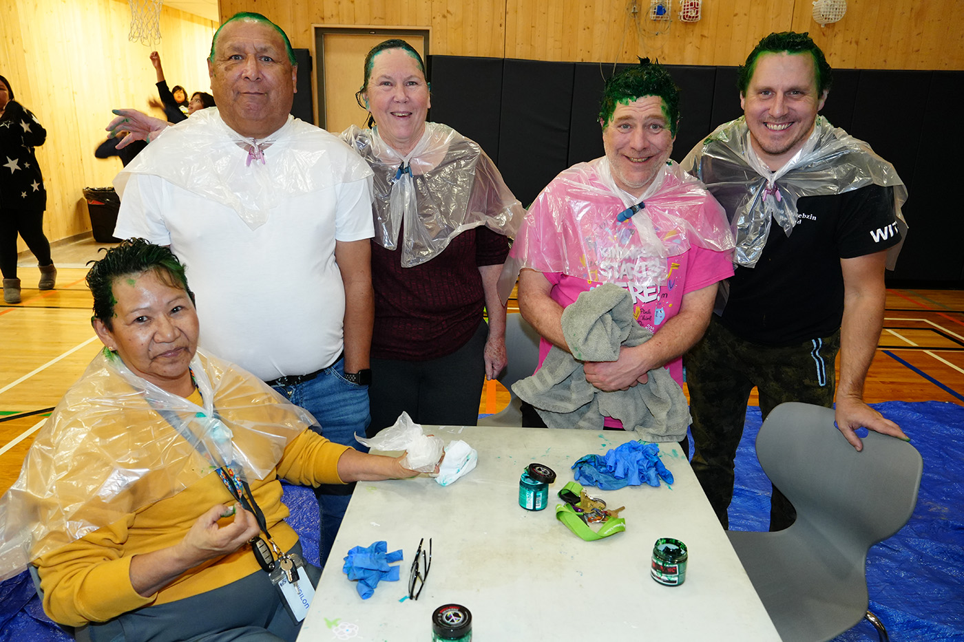 At precisely noon on November 28, the fundraising challenge closed, and Mr. Maracle, along with several Grade 8 students, went outside to grind the locks off and reveal the contents of the cashboxes. Students all gathered back inside their classroom to begin the process of counting the coins and bills, overseen by several staff members to ensure accuracy. After several counts, the amount fundraised totalled $4,682.25! The students were ecstatic! The hair dying was set to take place that afternoon at 2:00pm in the gym. Once tables and chairs [with garbage bags securely in place below to catch any bright green dye] were set up for the Fab 5 Educators, the fun and excitement continued. The Grade 8’s assembled around the dye station to watch the transformation take place. Gloves were donned by the dye applicators, and spectators stood with cell phones ready for Instagram worthy pics. Allowing the proper amount of time to pass to ensure the dye set to its full colour potential, staff, students, and visitors watched as each educator was treated to a new hair style, laughing and cheering the group in support of their bravery. The smiles were big and the generosity of everyone who volunteered their hair and their funds was even bigger. Chi miigwech to the educators who volunteered, and to the community for their donations to making the Green Hair Dye Challenge a reality, as well as the upcoming Graduation adventure.