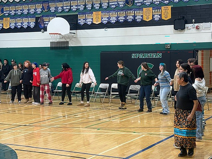 On Tuesday, December 2, 2025, during a one-hour Lunch ‘n Learn session at Espanola High School (EHS) Auditorium, Darren McGregor, Ekinoomagejig (Knowledge Keeper) with Nogdawindamin, provided students with an opportunity to gain knowledge about the Memorial Round Dance. The session was very well attended, with both Indigenous and non-Indigenous students present to learn. Miigwech to Guidance & Career Coach, Josephine Toulouse, and Karen Boyer, Indigenous Support Worker at EHS, for organizing this learning opportunity and the ‘traditional’ Subway lunch. All students of EHS are welcome to attend any Lunch ‘n Learn sessions offered throughout the school year. Contact Josephine Toulouse at: Toulouse_josephine@sagamok.ca if you or your student would like more information.