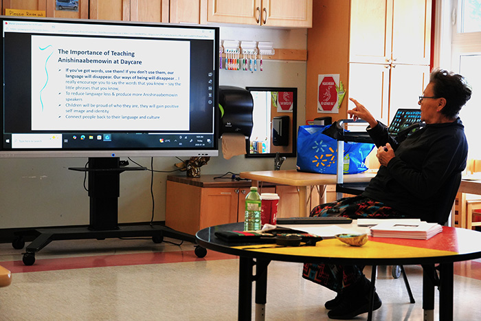 Barbara explained that acquiring and learning are two very different ways of becoming fluent speakers. In her opinion, acquiring a language through immersion is more effective than the other method. “Acquiring a language is a slow process and happens over time. It is subconscious – you don’t even know you’re doing it – it comes naturally. When you learn a language, you need instruction, to follow teachings, and to use your brain and think,” stated Barbara. By starting language revitalization at the Daycare level, through daily immersion and curriculum development, our youngest learners will have an opportunity to acquire the language, building a strong foundation for when they advance to Biidaaban and continue learning. From the presentation slide, Barbara reinforced this point, “Second Language Acquisition in early childhood is most effective through immersion, play-based, routine-driven environments.” Strategies to support this include: